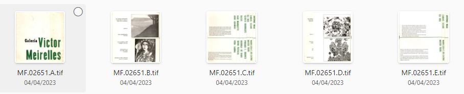 Coleção Coleção Instituto Meyer Filho Item MF.02651 28/11/2022 por Anna Serafim   Documento 2651 Baixar Metadados Miniatura Nº de registroMF.02651Localização no InstitutoMAPOTECA 1 - GAV. 9ColeçãoII. Artes plásticasTipoConviteTítuloExposição Arte Contemporânea PinturasAutoriaNILocal*Florianópolis (SC)Data Data 06/12/1979 Década 1970 Ano 1979 Mês e ano Dezembro de 1979 DescriçãoConvite da Exposição Arte Contemporânea Pinturas promovida em 6 de dezembro a 13 de dezembro de 1979 na Avenida Hercílio Luz, Florianópolis (SC) com participação de Meyer Filho.IndexadoresAvenida Hercílio Luz | Exposição Arte Contemporânea Pinturas | Meyer FilhoDimensão19,9 x 21,3 cmSuportePapelTécnicaImpressão sobre papelBordaNão se aplicaColorNão se aplicaEstado de conservaçãoBomDanos causados porManchas | Oxidação | Sujidades | Vincos e dobrasProcedimentosAcondicionado | Digitalizado | HigienizadoForma de aquisiçãoLicença de uso de direitos autorais gratuitaProcedência*Família Meyer FilhoData de aquisição Data NI Registrado porAnna Laura Borges SerafimData de registro28/11/2022Condições de ReproduçãoTodos os direitos reservados. Para utilização da imagem solicitar autorização ao Instituto Meyer Filho. Continue navegando MF.02522 MF.02462 Voltar para a página de itens