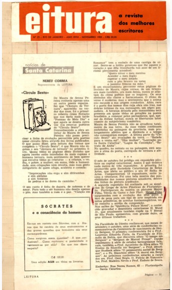 Coleção Coleção Instituto Meyer Filho Item MF.02757 28/11/2022 por Anna Serafim   Documento MF.02757 Baixar Metadados Miniatura Nº de registroMF.02757Localização no InstitutoMAPOTECA 1 - GAV. 7ColeçãoIII. PeriódicosTipoRevistaTítuloLeitura (RJ) 1959 - com grifoAutoriaNILocal*Rio de Janeiro (RJ)Data Década 1950 Ano 1959 Mês e ano Novembro de 1959 DescriçãoColagem com partes da revista Leitura, nº 29, ano 18, novembro 1959 com citação do nome de Meyer Filho em nota. Possui parte de texto destacada em caneta esferográfica vermelha.IndexadoresMeyer Filho | Revista LeituraDimensão19,5 x 32,7 cmSuportePapelTécnicaImpressão sobre papelBordaNão se aplicaColorNão se aplicaEstado de conservaçãoBomDanos causados porManchas | Marcas de cola | Ondulações | Sujidades | Vincos e dobrasProcedimentosAcondicionado | Digitalizado | HigienizadoForma de aquisiçãoLicença de uso de direitos autorais gratuitaProcedência*Família Meyer FilhoData de aquisição Data NI Registrado porAnna Laura Borges SerafimData de registro28/11/2022Condições de ReproduçãoTodos os direitos reservados. Para utilização da imagem solicitar autorização ao Instituto Meyer Filho. Continue navegando MF.02750 MF.02758 Voltar para a página de itens