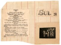 Recorte com partes da Revista Sul, ano 9, dezembro 1956, nº 28. (21,9 x 16,2 cm) Possui exemplar MF.02764.1.(27,3 x 40,1 cm). Ver revista completa, item MF.03122. Meyer Filho foi ilustrador da Revista Sul, conforme carteira de filiação MF.03177.