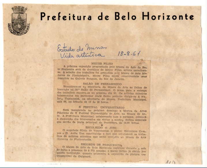 Coleção Coleção Instituto Meyer Filho Item MF.02769 29/11/2022 por Ana Julia Patricio   Documento MF.02769 Baixar Metadados Miniatura Nº de registroMF.02769Localização no InstitutoMAPOTECA 1 - GAV. 8 - PASTA 14ColeçãoIII. PeriódicosTipoJornalTítuloEstado de Minas (MG) 1961 - com grifoAutoriaNILocal*Belo Horizonte (MG) | Rio de Janeiro (RJ) | São Paulo (SP)Data Data 18/08/1961 Década 1960 Ano 1961 DescriçãoRecorte aderido em papel sulfite de edição datada de 18/08/1961 com matéria intitulada Meyer Filho sobre a exposição no Museu de Artes de Belo Horizonte. Possui inscrição do artista à caneta "Estado de Minas; Vida artística; 18-8-61" .IndexadoresEstado de Minas | Exposição | Jornal | Museu de Arte de Belo HorizonteDimensão20,5 x 16,5 cmSuportePapel de jornalTécnicaImpressão sobre papel jornalBordaNão se aplicaColorNão se aplicaEstado de conservaçãoBomDanos causados porAmarelecimento | Manchas | Oxidação | Papel aderido | Vincos e dobrasProcedimentosAcondicionado | Digitalizado | HigienizadoForma de aquisiçãoLicença de uso de direitos autorais gratuitaProcedência*Família Meyer FilhoData de aquisição Data NI Registrado porAna Julia Vieira PatrícioData de registro29/11/2022Condições de ReproduçãoTodos os direitos reservados. Para utilização da imagem solicitar autorização ao Instituto Meyer Filho. Continue navegando MF.02447 MF.02444 Voltar para a página de itens