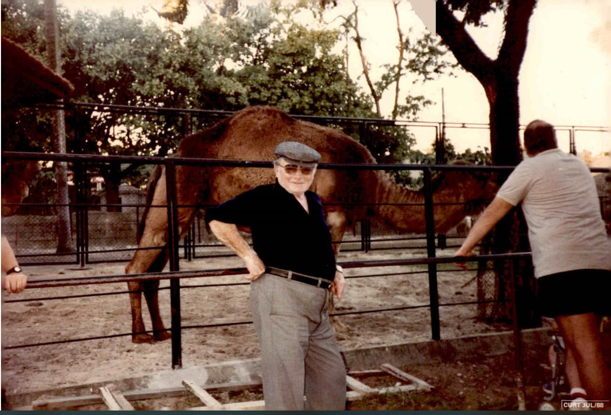 MF.02776.2 Retrato de Meyer Filho de boina no Zoológico, posando para foto e atrás dele um camelo. (10 x 15 cm).