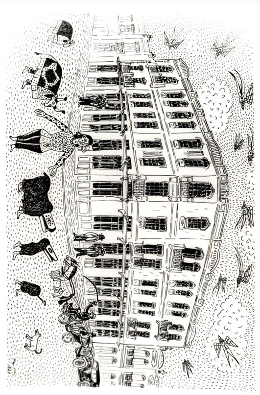 MF.02783.1 Casarão no estilo açoriano com diferentes personagens do boi de mamão (17,9 x 12 cm).