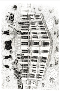 MF.02783.1 Casarão no estilo açoriano com diferentes personagens do boi de mamão (17,9 x 12 cm).