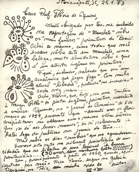 MF.02789.29 Fotocópia de correspondência manuscrita em três páginas, de Meyer Filho para Flávio de Aquino, Reitor da Universidade Federal de Santa Catarina, em 25/01/1973 agradecendo pela inclusão de seu nome entre os artistas primitivos do brasil na reportagem para a revista manchete. O conjunto foi bipartido em: MF.02789.29.1 e MF.02789.29.2 (20,9 x 27,2 cm).