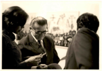 MF.02811.6 Pessoas [não identificadas]. Ao fundo os quadros do artista em exposição. Apresenta inscrições à caneta no verso.