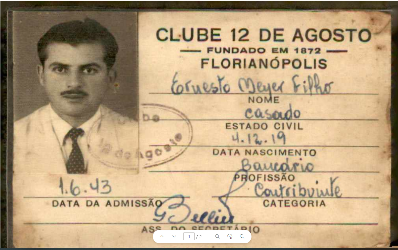 Coleção Coleção Instituto Meyer Filho Item MF.02841 15/12/2022 por Ana Julia Patricio   Documento 02841 Baixar Metadados Miniatura Nº de registroMF.02841Localização no InstitutoARQUIVO 2 - GAV. 2ColeçãoVII. Documentos PessoaisTipoCartãoTítuloCartão do Clube 12 de AgostoAutoriaNILocal*Florianópolis (SC)Data Data 01/06/1943 Década 1940 Ano 1943 DescriçãoCartão de Meyer Filho como sócio do Clube 12 de Agosto.IndexadoresClube Doze de Agosto | Meyer FilhoSuportePapel | PlásticoTécnicaImpressão e caneta esferográfica sobre papelColorNão se aplicaEstado de conservaçãoBomDanos causados porAmarelecimento | Sujidades | Vincos e dobrasProcedimentosAcondicionado | Digitalizado | HigienizadoForma de aquisiçãoLicença de uso de direitos autorais gratuitaProcedência*Família Meyer FilhoRegistrado porAna Julia Vieira PatrícioData de registro15/12/2022 Continue navegando MF.02842 MF.02839 Voltar para a página de itens