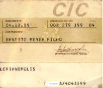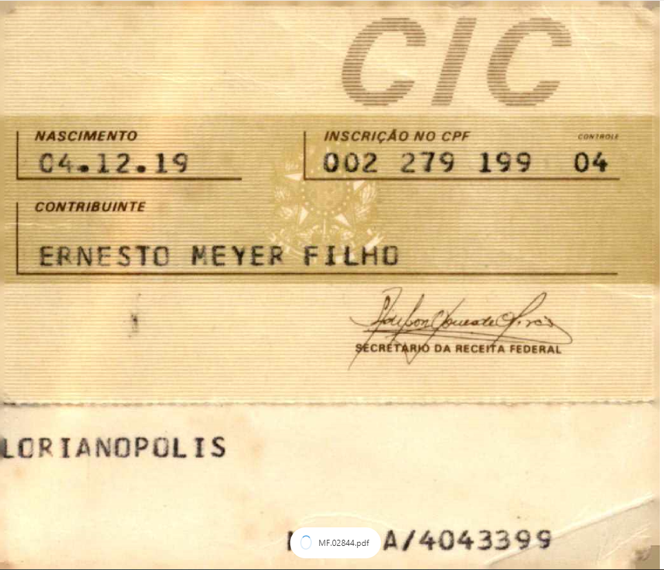 Coleção Coleção Instituto Meyer Filho Item MF.02844 16/12/2022 por Ana Julia Patricio   Documento 02844 Baixar Metadados Miniatura Nº de registroMF.02844Localização no InstitutoARQUIVO 2 - GAV. 2ColeçãoVII. Documentos PessoaisTipoCartãoTítuloCartão de Identificação do ContribuinteAutoriaNILocal*Florianópolis (SC)Data Data Sem data DescriçãoCartão de Identificação do Contribuinte de Meyer Filho, documento comprobatório de inscrição no cadastro de pessoas físicas pelo Ministério da Fazenda.IndexadoresCartão de Identificação do Contribuinte | Meyer FilhoDimensão8,8 x 7,7 cmSuportePapelTécnicaImpressão sobre papelBordaNão se aplicaColorNão se aplicaEstado de conservaçãoBomDanos causados porAmarelecimento | Desgaste | Sujidades | Vincos e dobrasProcedimentosAcondicionado | Digitalizado | HigienizadoForma de aquisiçãoDoaçãoProcedência*Família Meyer FilhoRegistrado porAna Julia Vieira PatrícioData de registro16/12/2022 Continue navegando MF.02836 MF.02848 Voltar para a página de itens