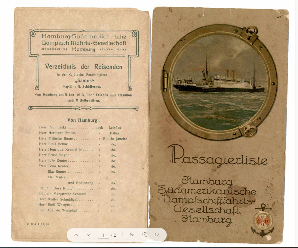Coleção Coleção Instituto Meyer Filho Item MF.02846 16/12/2022 por Ana Julia Patricio   Documento 02846 Baixar Metadados Miniatura Nº de registroMF.02846Localização no InstitutoARQUIVO 2 - GAV. 2ColeçãoVII. Documentos PessoaisTipoFolderTítuloFolder PassagierlisteAutoriaNILocal*NIData Década 19 Ano 1913 DescriçãoFolder de viagem em navio transatlântico em 1913, fazendo conexões em Santos e Rio de Janeiro. Como passageiro Ernest Meyer, pai de Meyer Filho.IndexadoresErnesto Meyer | Folder | Imigração | Santos (SP) | Transatlântico | ViagemDimensão11,2 x 19,4 cmSuportePapel | Papel cartãoTécnicaImpressão sobre papelBordaNão se aplicaColorNão se aplicaEstado de conservaçãoBomDanos causados porAmarelecimento | Descascamento | Desgaste | Manchas | Oxidação | Rasgo | Sujidades | Vincos e dobrasProcedimentosAcondicionado | Digitalizado | Higienizado | Realizar conservação curativaForma de aquisiçãoLicença de uso de direitos autorais gratuitaProcedência*Família Meyer FilhoRegistrado porAna Julia Vieira PatrícioData de registro16/12/2022 Continue navegando MF.02847 MF.02785 Voltar para a página de itens