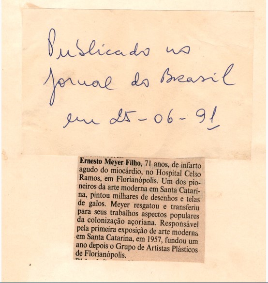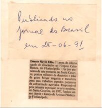 Coleção Coleção Instituto Meyer Filho Item MF.02857 21/12/2022 por Anna Serafim   Documento MF.02857 Baixar Metadados Miniatura Nº de registroMF.02857Localização no InstitutoMAPOTECA 1 - GAV. 7 - PASTA 5ColeçãoVIII. Arquivo InstitutoTipoJornalTítuloJornal do Brasil (RJ) 1991AutoriaNILocal*Rio de Janeiro (RJ)Data Data 25/06/1991 Década 1990 Ano 1991 DescriçãoRecorte de jornal de 25/06/1991 aderido a uma folha sulfite com trecho sobre Meyer Filho e detalhes de sua vida e morte.IndexadoresJornal do Brasil | Meyer Filho | PóstumaDimensão5,4 x 4,3 cmSuportePapel jornalTécnicaImpressão sobre papelBordaNão se aplicaColorNão se aplicaEstado de conservaçãoBomDanos causados porAmarelecimento | Papel aderido | Sujidades | Vincos e dobrasProcedimentosAcondicionado | Digitalizado | HigienizadoForma de aquisiçãoLicença de uso de direitos autorais gratuitaProcedência*Família Meyer FilhoRegistrado porAna Julia Vieira PatrícioData de registro21/12/2022Condições de ReproduçãoTodos os direitos reservados. Para utilização da imagem solicitar autorização ao Instituto Meyer Filho. Continue navegando MF.02861 MF.02858 Voltar para a página de itens