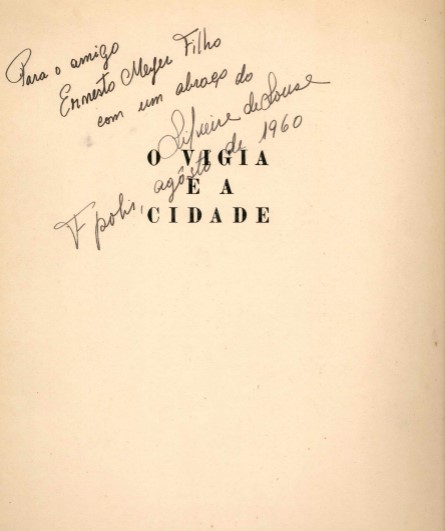 Livro: O Vigia e a Cidade - Xilografias de H. Mund Jr., de Silveira de Sousa, doado para Meyer Filho, com dedicatória "Para o amigo Ernesto Meyer Filho com um abraço do Silveira de Sousa Fpolis, agosto de 1960". O livro está bem fragilizado, com folhas soltas, possui 48 páginas com capa e contracapa.