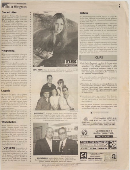 Coleção Coleção Instituto Meyer Filho Item MF.02890 19/12/2022 por Anna Serafim   Documento MF.02890 Baixar Metadados Miniatura Nº de registroMF.02890Localização no InstitutoMAPOTECA 1 - GAV. 8 - PASTA 11ColeçãoIII. PeriódicosTipoJornalTítuloDiário Catarinense (SC) - 1999AutoriaNILocal*Florianópolis (SC)Data Data 11/07/1999 Década 1990 Ano 1999 DescriçãoFolha de jornal de 11/07/1999 com destaque para página 3, com trecho da coluna de Juliana Wosgraus sobre evento póstumo dos 80 anos de Meyer Filho no MASCIndexadoresDiário Catarinense | Exposição | Juliana Wosgraus | Meyer Filho | Museu de Arte de Santa Catarina (MASC) | Póstuma | Sandra Meyer NunesDimensão29 x 38,1 cmSuportePapel de jornalTécnicaImpressão sobre papelBordaNão se aplicaColorNão se aplicaEstado de conservaçãoBomDanos causados porAmarelecimento | Rasgo | Sujidades | Vincos e dobrasProcedimentosAcondicionado | Digitalizado | Higienizado | Realizar conservação curativaForma de aquisiçãoLicença de uso de direitos autorais gratuitaProcedência*Família Meyer FilhoRegistrado porAna Julia Vieira PatrícioData de registro20/12/2022Condições de ReproduçãoTodos os direitos reservados. Para utilização da imagem solicitar autorização ao Instituto Meyer Filho. Continue navegando MF.02891 MF.02886 Voltar para a página de itens