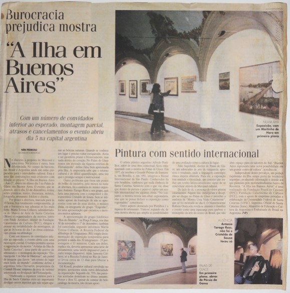 MF.02917.2 Recorte de jornal de 2006, com destaque para a matéria intitulada "A Ilha em Buenos Aires", com autoria de Neri Pedroso, sobre a exposição do catarinense na Argentina. (33,9 x 33 cm).