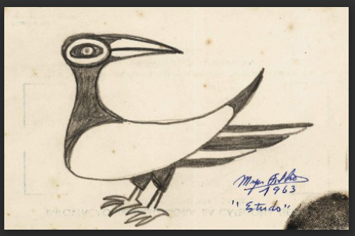 Desenho em nanquim e lápis de cor sobre papel, aderido a papel cartão, de ave híbrida. A obra intitulada "Estudo" foi assinada, datada e possui a impressão digital do artista.