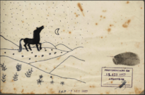 Desenho em caneta, possivelmente hidrográfica, sobre papel de paisagem com vegetação e animal que remete a cavalo. Obra datada, assinada com a sigla do artista e impressão digital. Apresenta ainda impressão de carimbo utilizado em arquivo. O desenho está aderido a um papel cartão.