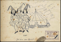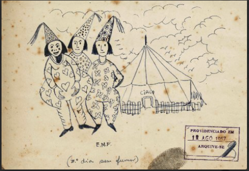 Desenho em caneta, possivelmente hidrográfica, intitulada "3º dia sem fumar". A composição apresenta três palhaços e tenda de circo ao fundo. Obra datada, assinada com a sigla do artista e impressão digital. Apresenta ainda impressão de carimbo utilizado em arquivo. O desenho está aderido a um papel cartão.