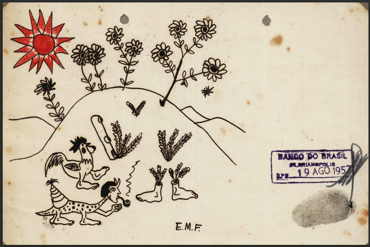 Desenho em caneta, possivelmente hidrográfica, e lápis de cor sobre papel de paisagem com vegetação, seres híbridos e sol. Obra datada, assinada com a sigla do artista e impressão digital.