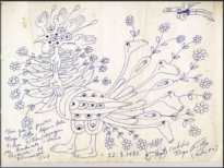 Desenho em caneta esferográfica sobre papel de galo híbrido. Apresenta a inscrição "Um galo do pintor Meyer Filho, depois dele tomou 3 cervejas na lanchonete 'Banco Redondo' de Florianópolis (SC)". Obra datada e com assinaturas de Meyer cidadão e artista.