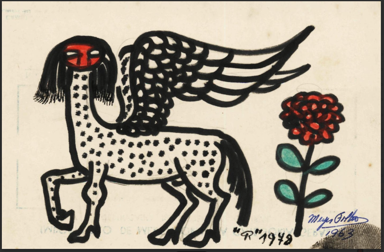 Coleção Coleção Instituto Meyer Filho Item MF.03041 23/01/2023 por Anna Serafim   Documento 03041 Baixar Metadados Miniatura Nº de registroMF.03041Outros registros Outros registros 63046 Outros registros 67F Localização no InstitutoARQUIVO 2 - GAV. 1ColeçãoII. Artes plásticasTipoDesenhoTítuloNIAutoriaMeyer FilhoLocal*Florianópolis (SC)Data Década 1970 Ano 1978 DescriçãoDesenho em nanquim e lápis de cor sobre papel, aderido à papel cartão, de ser híbrido quadrupede com asas e flor. Obra assinada, datada e com a impressão digital do artista, realizada em papel de certificado de cobertura cambial.IndexadoresHíbridos | Ser aladoDimensão14,5 x 9,5 cmSuportePapel | Papel cartãoTécnicaNanquim e guache sobre papelBordaNão se aplicaColorNão se aplicaEstado de conservaçãoBomDanos causados porAmarelecimento | Desgaste | Oxidação | Vincos e dobrasProcedimentosAcondicionado | Digitalizado | HigienizadoForma de aquisiçãoLicença de uso de direitos autorais gratuitaProcedência*Família Meyer FilhoData de aquisição Data NI Registrado porAnna Julia Borges SerafimData de registro24/01/2023Condições de ReproduçãoTodos os direitos reservados. Para utilização da imagem solicitar autorização ao Instituto Meyer Filho. Continue navegando MF.00299 MF.03215 Voltar para a página de itens