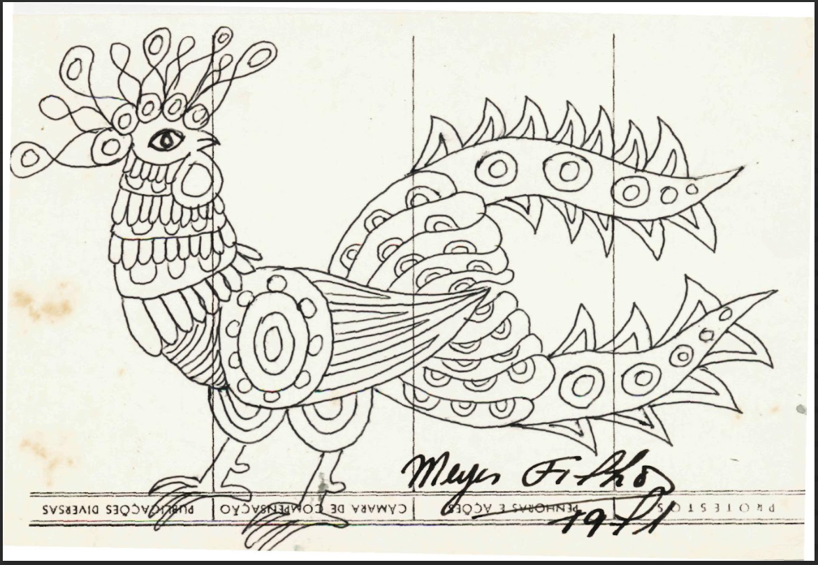 Coleção Coleção Instituto Meyer Filho Item MF.03054 23/01/2023 por Anna Serafim   Documento 03054 Baixar Metadados Miniatura Nº de registroMF.03054Localização no InstitutoARQUIVO 2 - GAV. 1ColeçãoII. Artes plásticasTipoDesenhoTítuloNIAutoriaMeyer FilhoLocal*Florianópolis (SC)Data Década 1970 Ano 1971 DescriçãoDesenho em caneta esferográfica preta sobre papel de galo estilizado. Obra datada e assinada.IndexadoresGalosDimensão15,3 x 10,2 cmSuportePapel cartãoTécnicaCaneta esferográfica sobre papelBordaNão se aplicaColorNão se aplicaEstado de conservaçãoBomDanos causados porAmarelecimento | Desgaste | ManchasProcedimentosAcondicionado | Digitalizado | HigienizadoForma de aquisiçãoLicença de uso de direitos autorais gratuitaProcedência*Família Meyer FilhoData de aquisição Data NI ObservaçõesObra realizada em papel proveniente do Banco do Brasil.Registrado porAnna Julia Borges SerafimData de registro30/01/2023Condições de ReproduçãoTodos os direitos reservados. Para utilização da imagem solicitar autorização ao Instituto Meyer Filho. Continue navegando MF.03061 MF.03128 Voltar para a página de itens