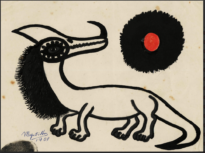Desenho em nanquim e lápis de cor vermelho sobre papel, aderido a papel cartão, de animal hibrido com crina e chifre, além de representação de sol. Obra datada, com a impressão digital do artista e assinada "Meyer Filho - 1963", com caneta esferográfica na cor azul.