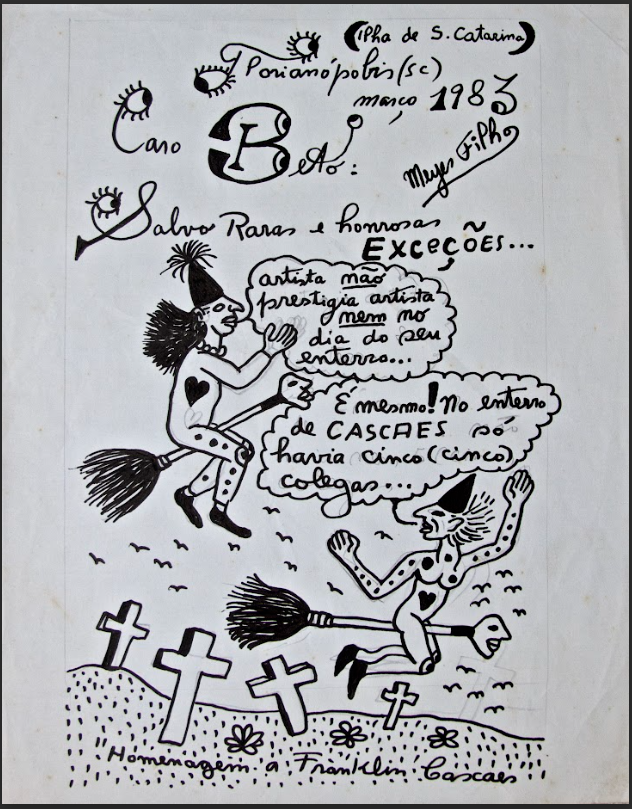 Coleção Coleção Instituto Meyer Filho Item MF.03082 23/01/2023 por Anna Serafim   Documento 03082 Baixar Metadados Miniatura Nº de registroMF.03082Outros registros Outros registros 83010 Localização no InstitutoMAPOTECA 1 - GAV. 3ColeçãoII. Artes plásticasTipoDesenhoTítuloHomenagem a Franklin CascaesAutoriaMeyer FilhoLocal*Florianópolis (SC)Data Década 1980 Ano 1983 Mês e ano Março de 1983 DescriçãoDesenho em nanquim sobre papel de croniqueta para a coluna do Beto Stoedick sobre o enterro de Franklin Cascaes. Apresenta bruxas e símbolos de cruz.IndexadoresBruxas | Franklin CascaesDimensão21 x 26,7 cmSuportePapelTécnicaNanquim sobre papelBordaNão se aplicaColorNão se aplicaEstado de conservaçãoBomDanos causados porAmarelecimento | Manchas | Vincos e dobrasProcedimentosAcondicionado | Digitalizado | HigienizadoForma de aquisiçãoLicença de uso de direitos autorais gratuitaProcedência*Família Meyer FilhoData de aquisição Data NI Registrado porAnna Julia Borges SerafimData de registro30/01/2023Condições de ReproduçãoTodos os direitos reservados. Para utilização da imagem solicitar autorização ao Instituto Meyer Filho. Continue navegando MF.03091 MF.03080 Voltar para a página de itens