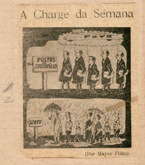 Coleção Coleção Instituto Meyer Filho Item MF.03128 23/01/2023 por Anna Serafim   Documento MF.03128 Baixar Metadados Miniatura Nº de registroMF.03128Localização no InstitutoMAPOTECA 1 - GAV. 8 - PASTA 11ColeçãoIII. PeriódicosTipoJornalTítuloCharge da semanaAutoriaMeyer FilhoLocal*Florianópolis (SC)Data Data NI DescriçãoRecorte de jornal com charge "postos de sacrifício" criada por Meyer Filho em jornal não identificado. O recorte está aderido em papel quadriculado. Possui fotocópia MF.03128.1 (21,6 x 32,9 cm)IndexadoresChargeDimensão18 x 19,8 cmSuportePapelTécnicaImpressão sobre papelBordaNão se aplicaColorNão se aplicaEstado de conservaçãoRegularDanos causados porAmarelecimento | Manchas | Marcas de cola | Oxidação | RasgoProcedimentosAcondicionado | Digitalizado | HigienizadoForma de aquisiçãoLicença de uso de direitos autorais gratuitaProcedência*Família Meyer FilhoData de aquisição Data NI Registrado porAnna Julia Borges SerafimData de registro26/01/2023Condições de ReproduçãoTodos os direitos reservados. Para utilização da imagem solicitar autorização ao Instituto Meyer Filho. Continue navegando MF.03054 MF.03055 Voltar para a página de itens