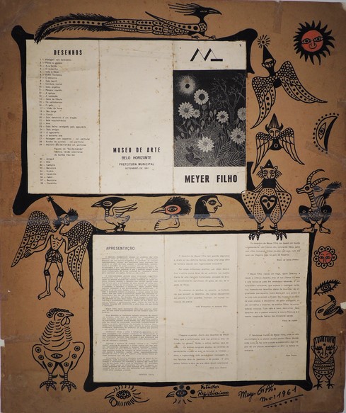 Montagem de convites de exposição de Meyer Filho no Museu de Arte de Belo Horizonte. Os convites estão aderidos a papel cartão onde observam-se diversos desenhos de figuras híbridas, possivelmente da série intitulada pelo artista de Cósmico ou Sideral, além de sol e galo.