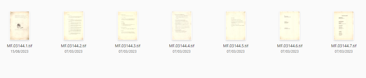 Coleção Coleção Instituto Meyer Filho Item MF.03144 30/01/2023 por Anna Serafim   Documento 3144 Baixar Metadados Miniatura Nº de registroMF.03144Localização no InstitutoMAPOTECA 1 - PRATELEIRA 6 - PASTA AColeçãoVII. Documentos PessoaisTipoProjetoTítuloProjeto Verde-Funarte Santa CatarinaAutoriaFundação Nacional de Arte (FUNARTE)Local*Florianópolis (SC)Data Década 1970 Ano 1978 DescriçãoProjeto "Verde-Funarte" Santa Catarina datilografado e com 7 páginas, datado de 1978. O projeto versa sobre à conscientização de alunos do 1º grau sobre artistas locais. Na capa observa-se desenho de cabeça de galo datado de 01/02/1978.IndexadoresGalos | Projeto Verde FunarteDimensão21,3 x 31,6 cmSuportePapelTécnicaMecanografia e caneta esferográfica sobre papelColorNão se aplicaEstado de conservaçãoBomDanos causados porAmarelecimento | Manchas | Perfuração | Vincos e dobrasProcedimentosAcondicionado | Digitalizado | HigienizadoForma de aquisiçãoLicença de uso de direitos autorais gratuitaProcedência*Família Meyer FilhoData de aquisição Data NI ObservaçõesFoi realizada reparação com fita japonesa nos rasgos.Registrado porAnna Julia Borges SerafimData de registro30/01/2023Condições de ReproduçãoTodos os direitos reservados. Para utilização da imagem solicitar autorização ao Instituto Meyer Filho. Continue navegando MF.00296 MF.02835 Voltar para a página de itens