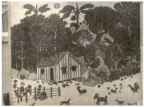 MF.03180.24 Paisagem com duas casas, galo e vegetação, datada de 1976 (17,6 x 12,6 cm).