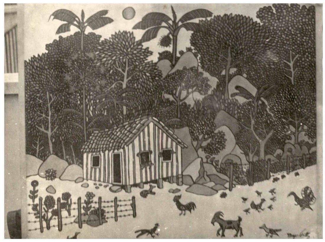 MF.03180.5 Paisagem com casa, vegetação e galo, datada de 1977 (imagem em PB/ 18 x 12 cm).