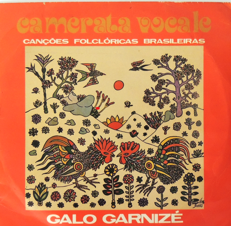 Disco da Camerata Vocale, Canções Folclóricas Brasileiras, "Galo Garnizé" com arte da capa realizada por Meyer Filho. Apresenta dedicatória a caneta esferográfica no verso da capa (MF.03210.1.1) e outros dois exemplares MF.03210.2 e MF.03210.3 com dedicatória de Telmo Locateli na capa.