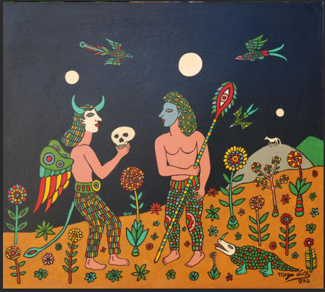 Pintura sobre Eucatex de seres híbridos alados nas cores predominantes ocre, preto e verde. No entorno observa-se vegetação, ave e outro ser híbrido. Obra datada e assinada. No verso possui papel aderido com título, assinatura e marca de carimbo "Impressão digital de meu polegar direito que autentica meu desenho no anverso desta folha. Ernesto Meyer Filho, Rua Altamiro Guimarães, 30. Telefone 3131 Florianópolis Santa Catarina Brasil".